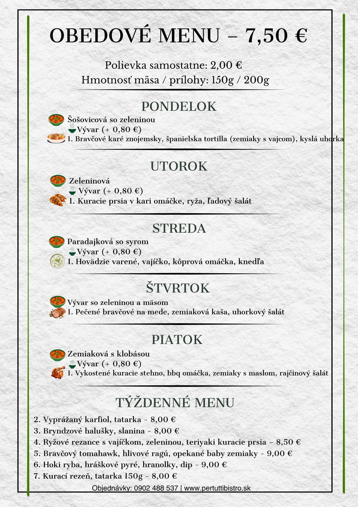 Reštaurácia PerTutti v Moravskom Svätom Jáne je tu pre všetkých, ktorí si chcú počas pracovného týždňa dopriať chutné a poctivé obedové menu. Každý pracovný deň pripravujú čerstvé jedlá za výhodné ceny, ktoré si môžete vychutnať pohodlne u nich alebo si ich nechať doručiť až domov či do práce.